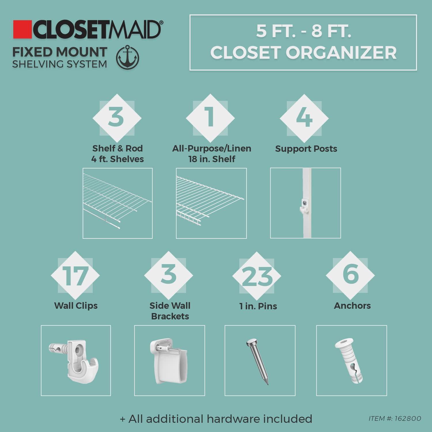 ClosetMaid 5037 5ft. to 8ft. Fixed Mount Closet Organizer Kit, White