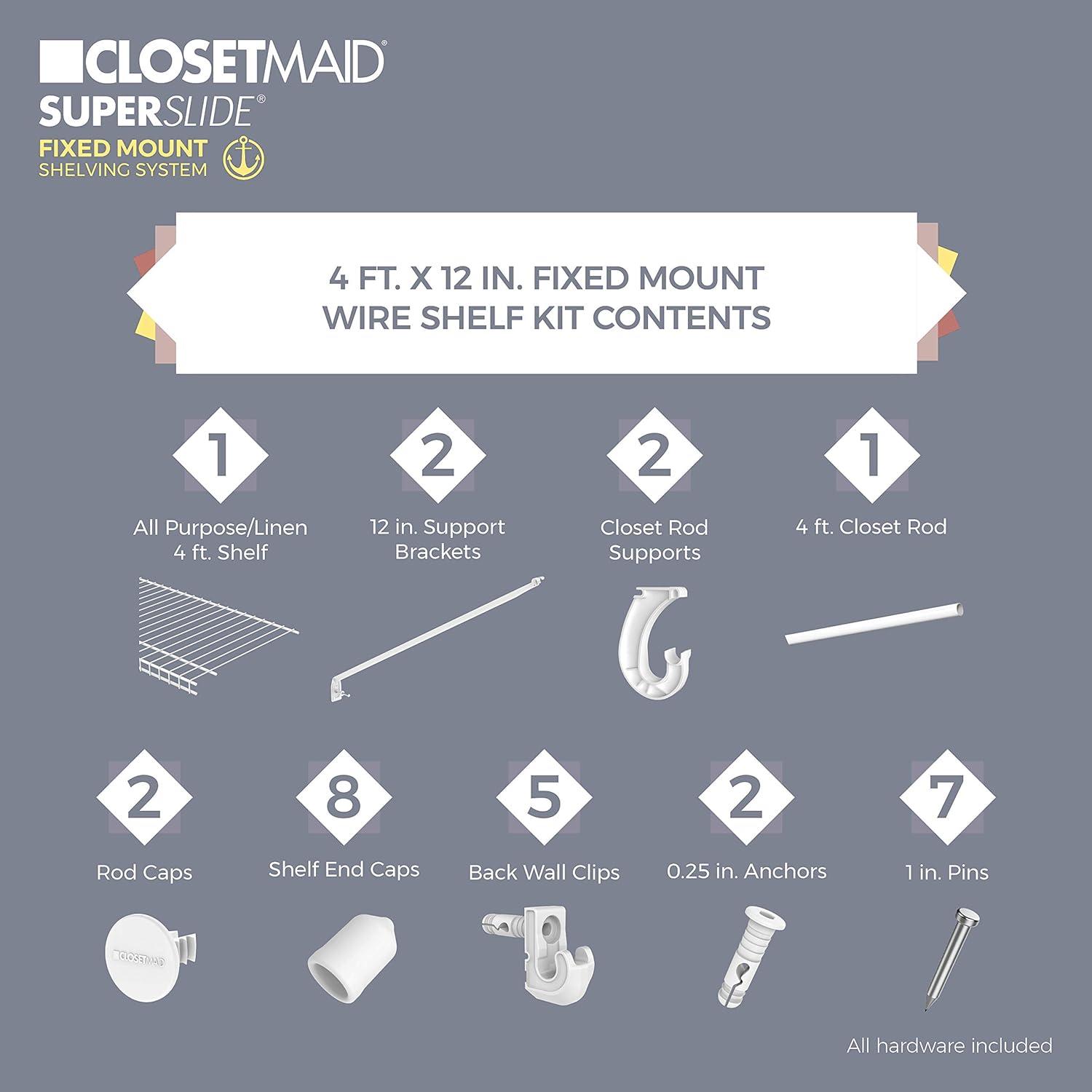 ClosetMaid 5632 Super Slide Ventilated Shelf Kit With Closet Rod, 6′ by 12″, White(4 ft x 12 in)