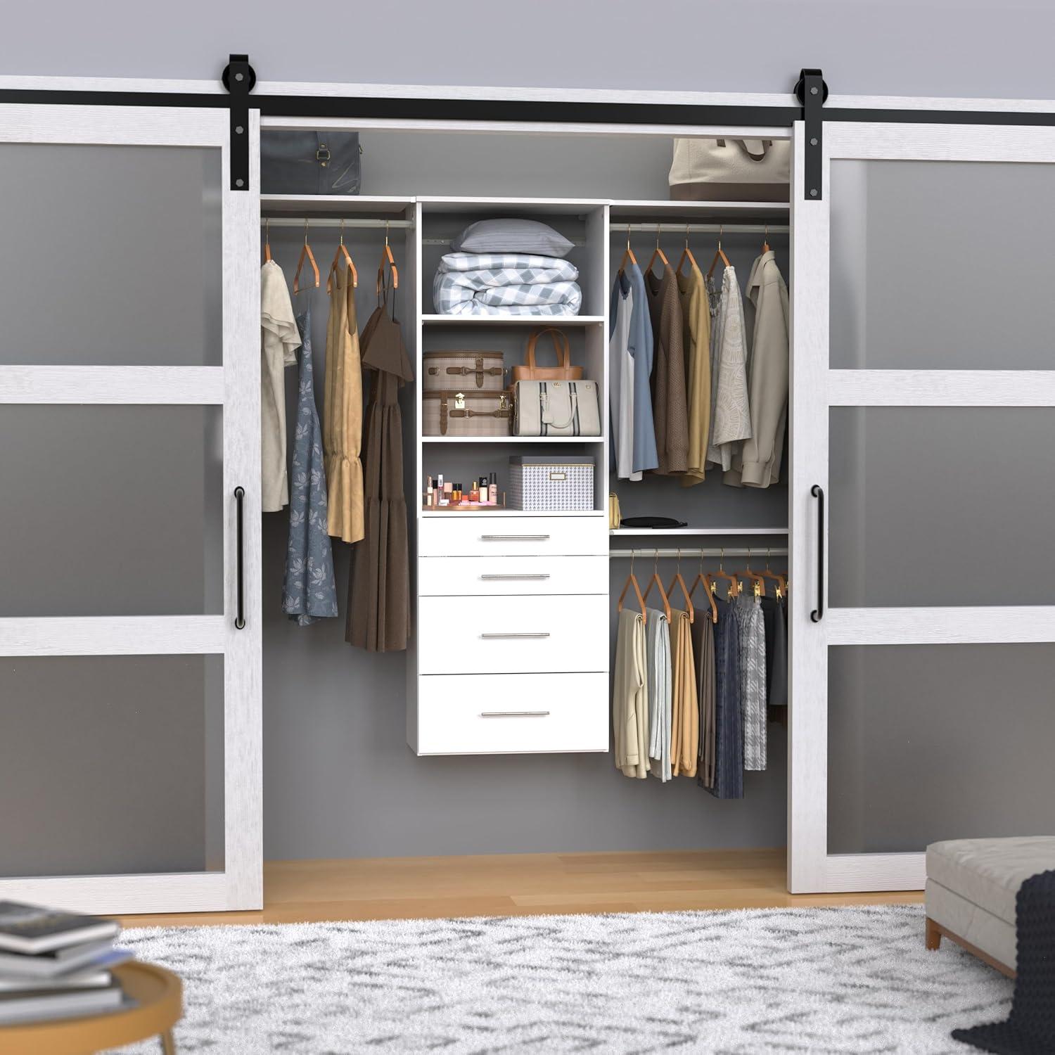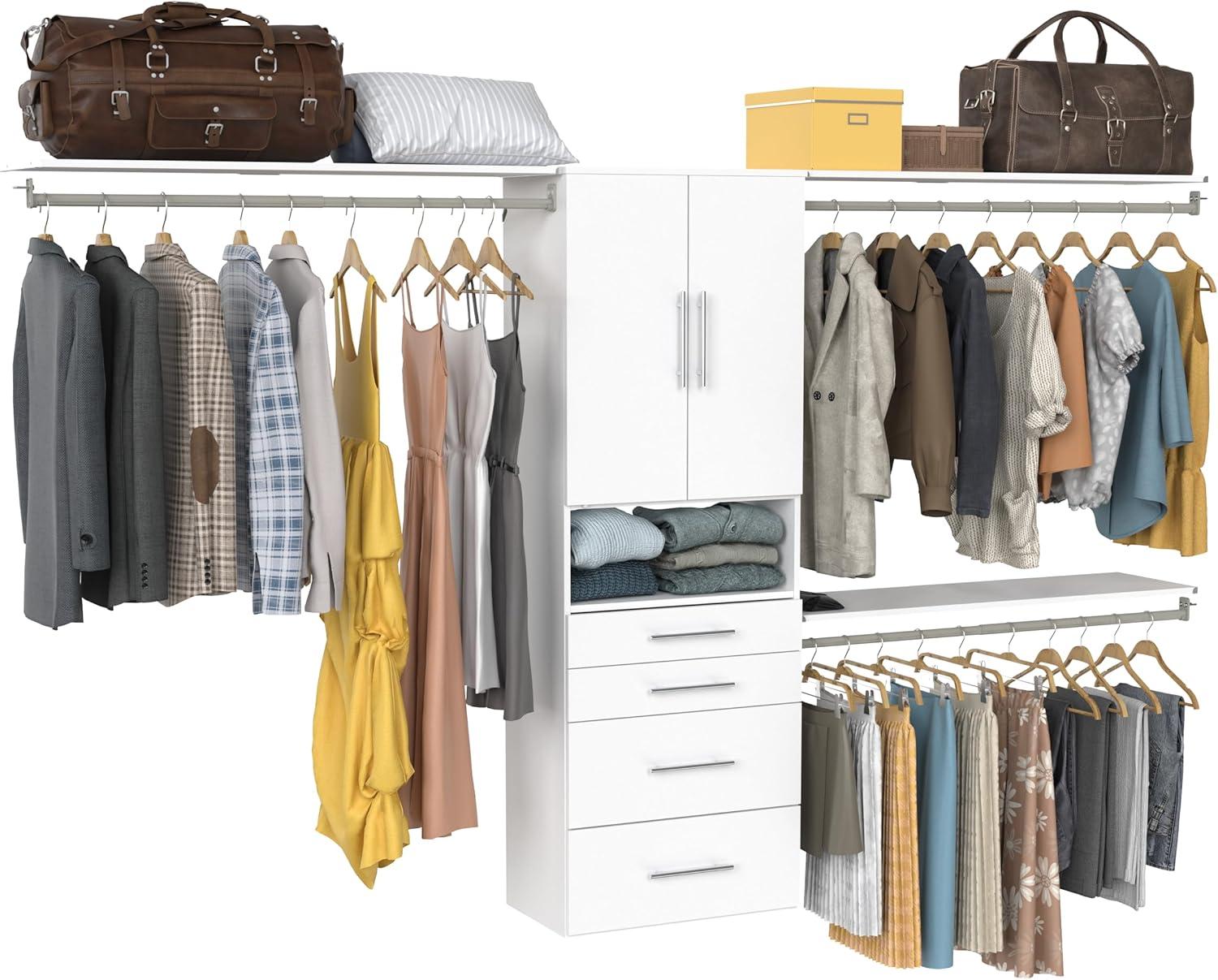 ClosetMaid SuiteSymphony Hanging Closet Kit Includes (1) Tower, (3) Closet Rods, (4) Shelves, (3) Top Shelves w/Brackets, (4) Drawers, and (1) Closet Door Set, White