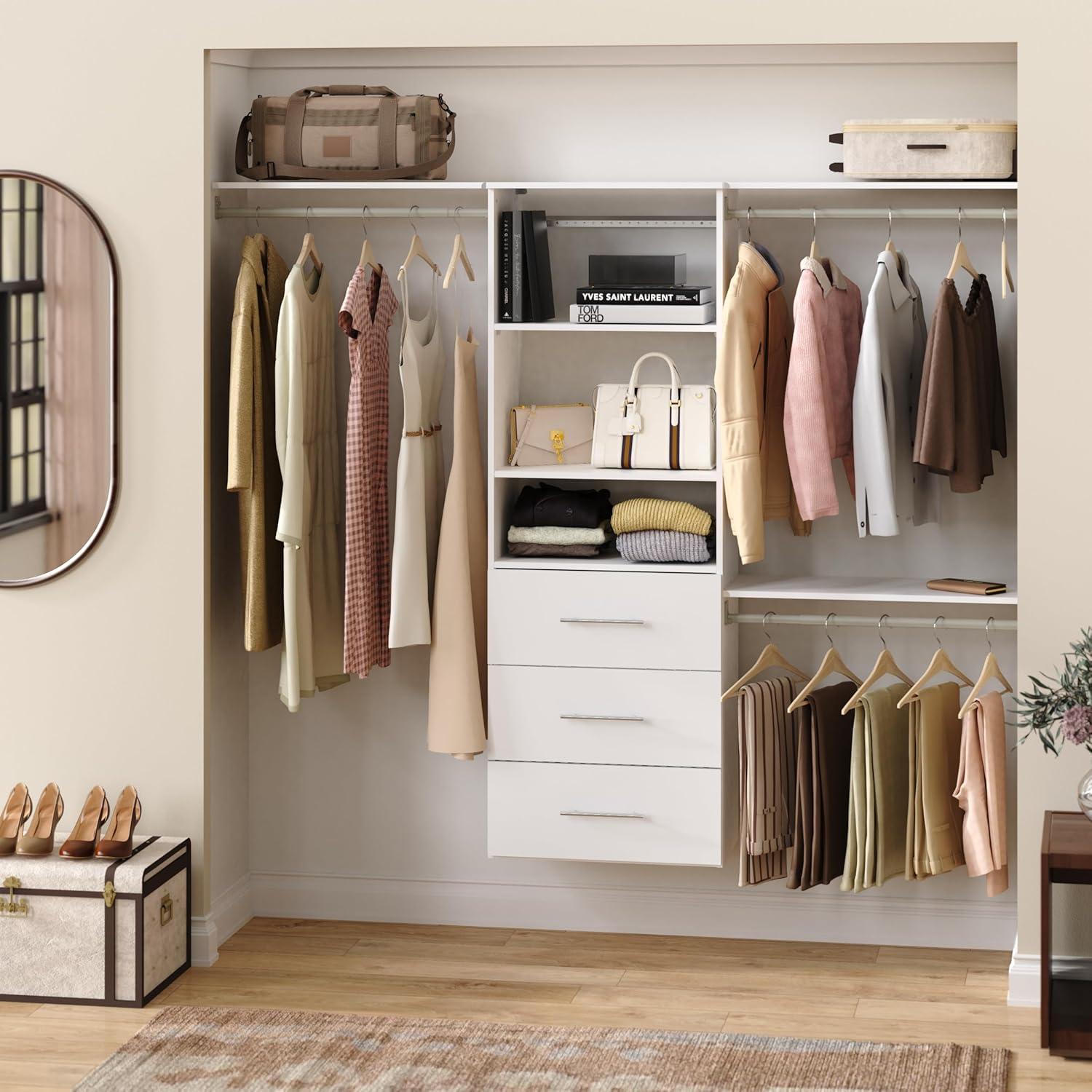 ClosetMaid SuiteSymphony Modern Hanging Closet Kit Includes (1) Tower, (3) Closet Rods, (4) Shelves, (3) Top Shelves w/Brackets, (3) Drawers, and (1) Closet Door Set, White