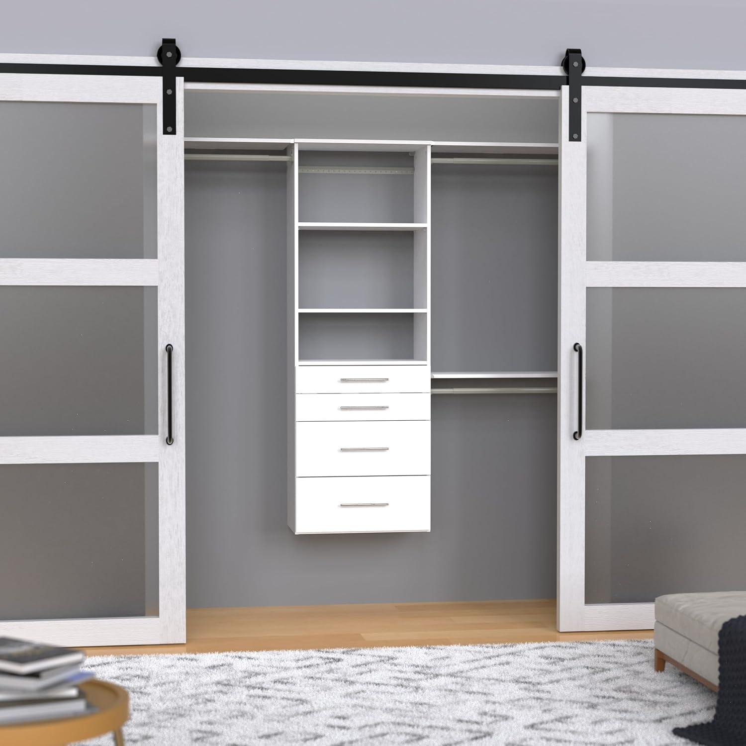 ClosetMaid SuiteSymphony Modern Hanging Closet Kit Includes (1) Tower, (3) Closet Rods, (4) Shelves, (3) Top Shelves w/Brackets, (4) Drawers and (1) Closet Door Set, White