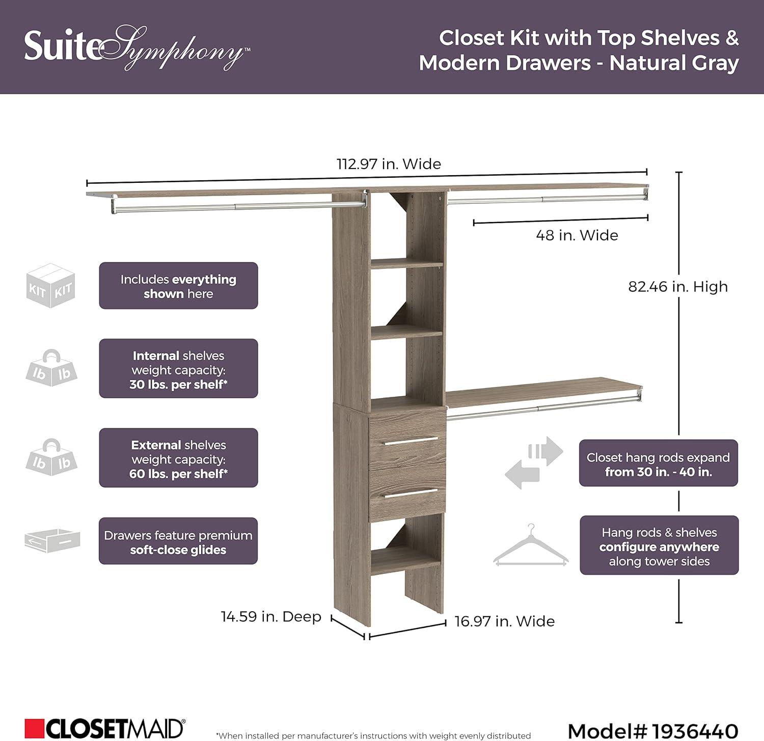 ClosetMaid 1937440 SuiteSymphony Modern 16-Inch Closet Organizer with Shelves and 2-Drawers, Pure White(Natural Gray)