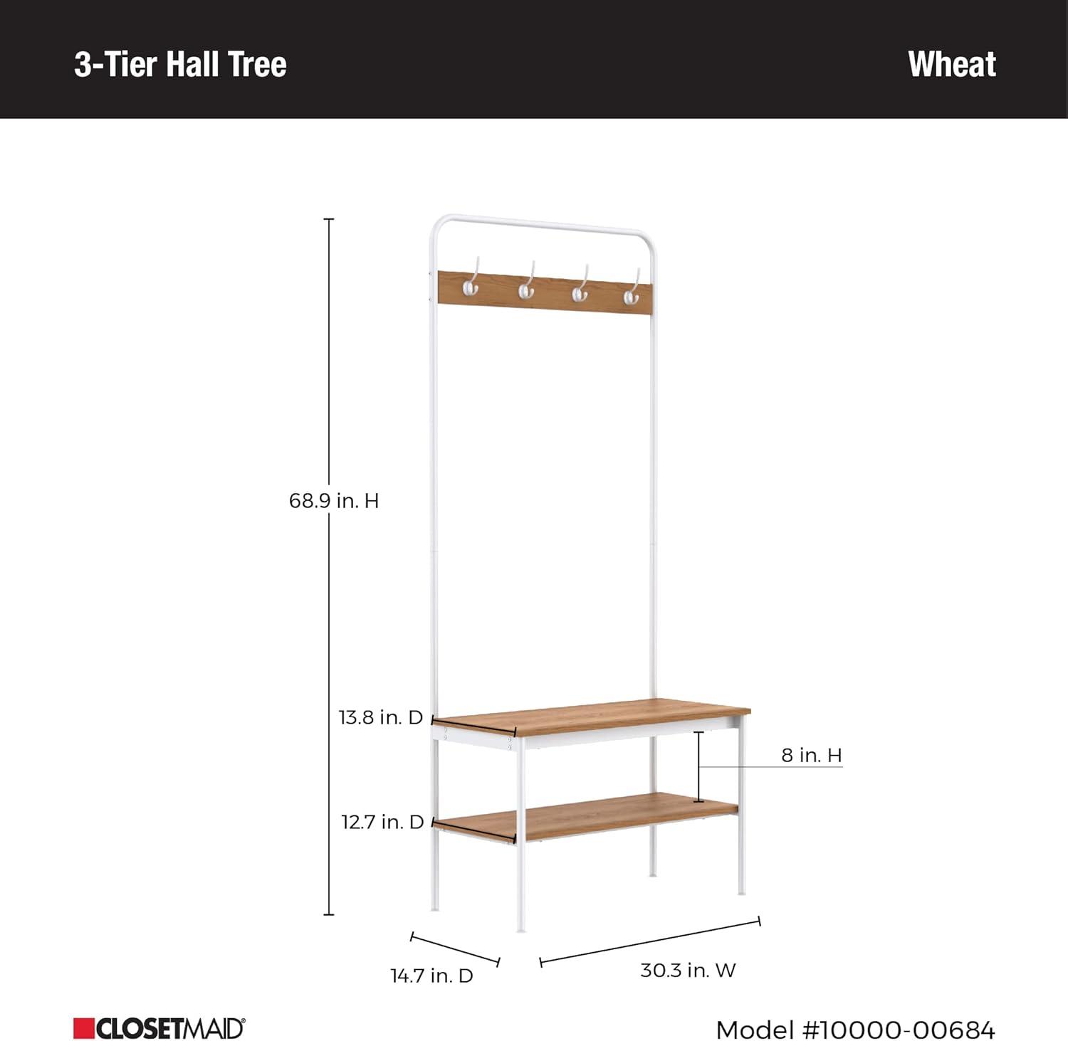 ClosetMaid Hall Tree with Shoe Bench 4 Hooks and Storage Shelf, Coat Rack, Wheat/White Metal(Wheat With White Metal)