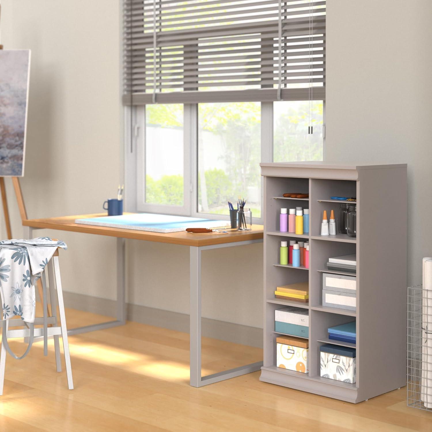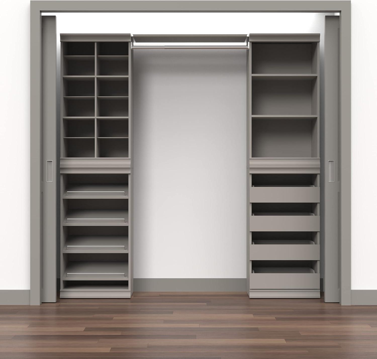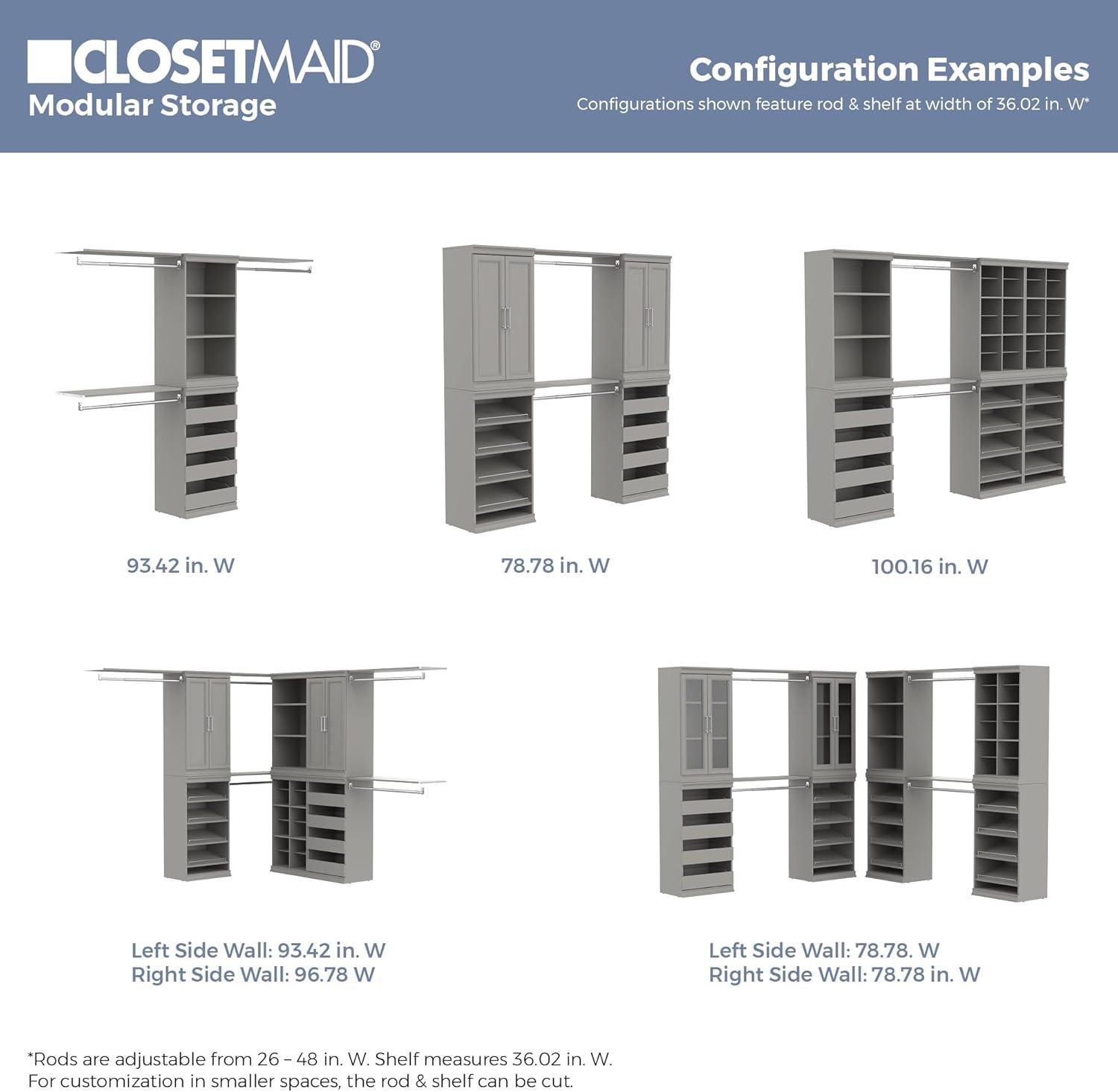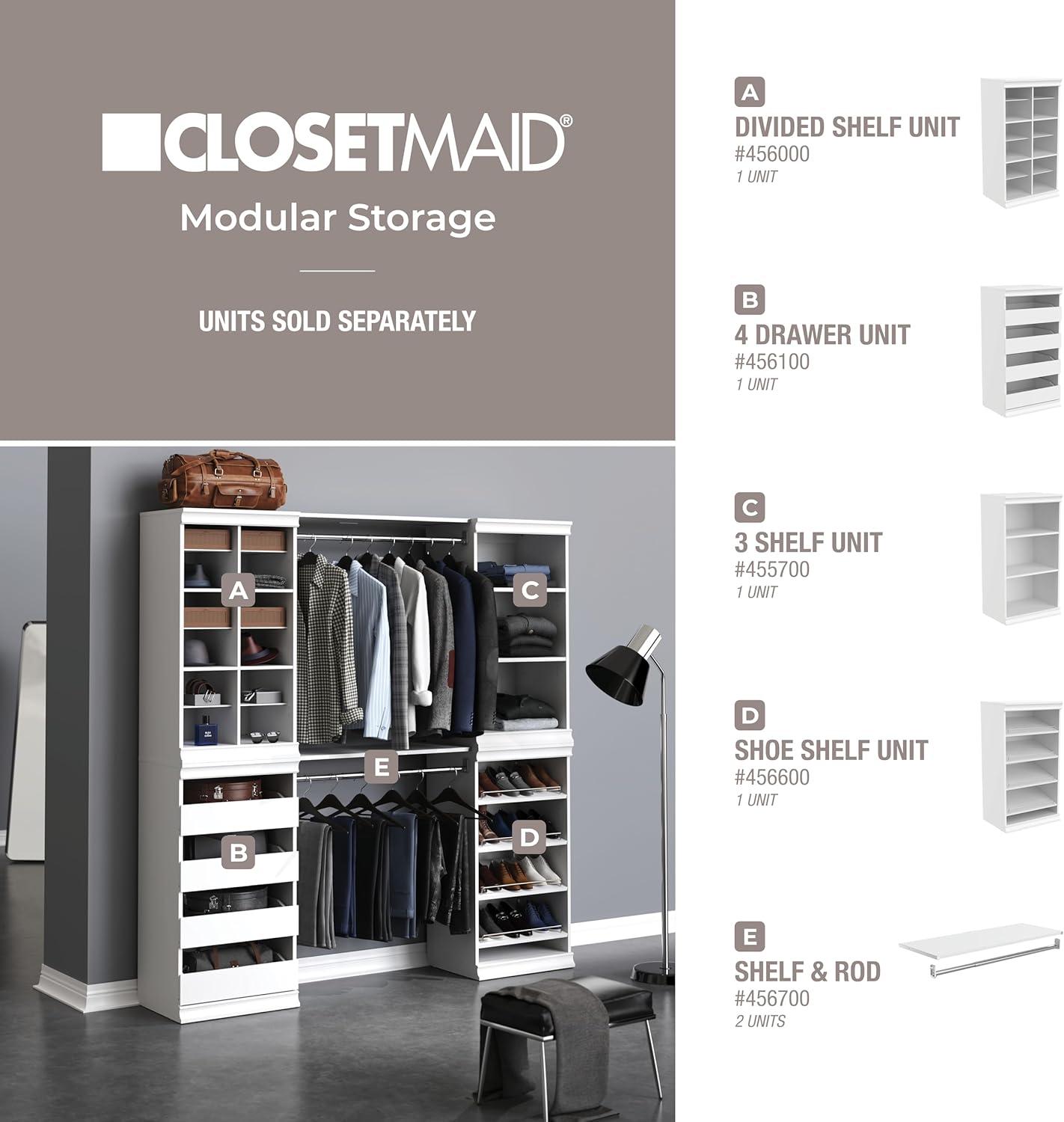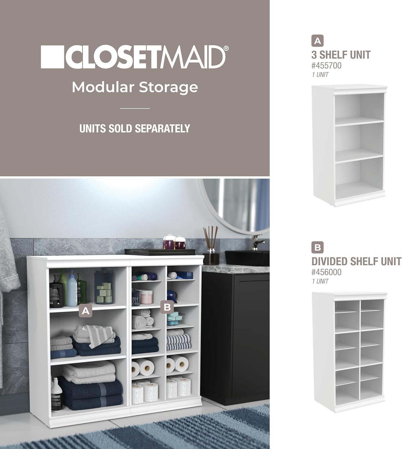 The ClosetMaid Modular Storage Collection is a versatile and trendy organization system. With four shelf unit options, the collection allows you to utilize the entire system or individual pieces to fit your space. With an easy to assemble and install DIY design, add the Modular Storage collection to your closet, office, living room, den, mudroom or anywhere in your home for organization. The Divided Storage Shelf Unit can be easily stacked with other units, or with other Shelf Units or used on its own. It features 12 adjustable interior shelves with dividers to store and organizes folded clothes, sweaters, pants, jeans, shoes, blankets, towels, books, crafts or decorative items. The decorative trim and full backer make this wood shelf system ideal for creating an upscale custom closet look. Add on other units like a Divided Shelf Unit, Shoe Shelf Unit or Drawer Unit to build a walk in or reach in closet, or a full office shelf system. Easily add on accessories like Shelf & Hang Rod Kits or Doors available with solid or glass panes to create the organization system of your dreams. The Modular Storage Collection is available in trendy White or Smoky Taupe finishes to fit into the style of your home.