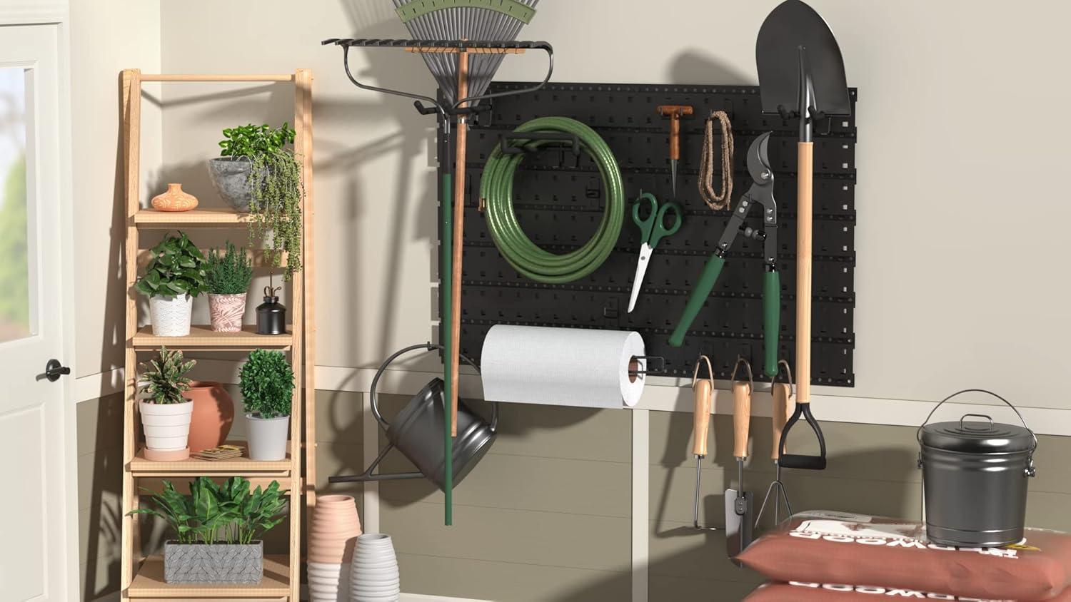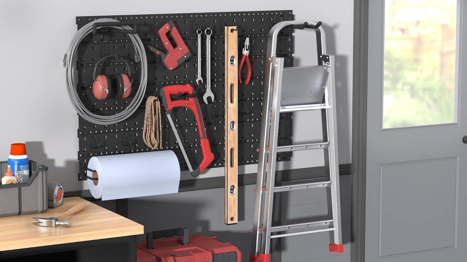 Transform your garage space with the functional, high-quality ProGarage Slatwall Hang Track system by ClosetMaid. This flexible, versatile & strong garage organizer wall functions as a garage rail system, peg board wall and slatwall organizer all in one. The all-in-one set includes ((1) 8 in. Double Hook, (1) 4 in. Double Hook, (1) 4 in. Loop Hook, (1) Paper Towel Holder, (1) Parts Bin Set with 4 Bins & (3) Deep Single Peg Hooks. The strong hooks are designed for power tools, cords, hand tools, cords, small items & more. Keep things clean and cleared from clutter with the paper towel holder. The set of 4 parts bins are designed to be installed together for hardware like screws, nuts or bolts. Seven durable rails are included to build a wall measuring 42 in. wide and 21.6 in. H that’s perfect to be installed above a workbench, under garage cabinets or on a wall. Use to organize your tools like wrenches, hammers & screwdrivers. Or in a garden shed for hand tools, rakes, pruning tools, hoses or watering tools. This easy to install system includes everything you need to securely install to studs or concrete. The hooks & accessories can be easily attached & adjusted to fit your needs. Get organized with ClosetMaid‘s ProGarge collection in your garage, shed or utility room.